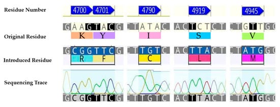 In the current study, candidate diamide interacting residues on the insect RyR channel identified in previous studies were further scrutinized and assessed through alignment of 44 arthropod, nematode and vertebrate RyR amino acid sequences. Highly conserved but distinct insect vs. mammalian residues K4700R and Y4701F (located on TMS1), I4790C (TMS2), S4919L (TMS3) and V4945M (TMS4) (Figure 1a), were considered suitable candidates for further study. The justifications for their selection are summarized in Table 1.