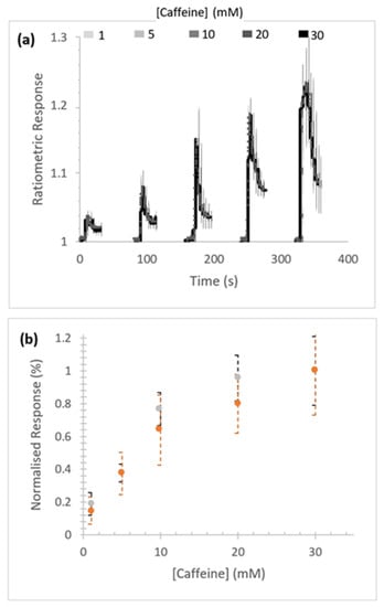 Responses of individual cells to the application of caffeine and then diamide compounds were recorded. Diamide response amplitude was normalised to the prior caffeine response to create a response ratio, which was then normalised against the maximal caffeine responses to establish the proportional normalised response (PNR). In brief, to calculate the PNR, raw data was normalized using the equation: R/R0, where R is the fluorescence ratio value recorded for an individual cell upon each individual time point and R0 is an average fluorescence ratio calculated over the first 5 s prior to addition of the agonist. The maximum response amplitude is taken as the maximum fluorescence signal outputted by the cell across all time frames. Final amplitude data is presented as a mean value and the standard deviation of the mean. In all the concentration–response plots, response data is expressed as a percentage of the highest response registered. The magnitude of Ca2+ release occurring in response to diamide addition was normalized to the initial caffeine-evoked Ca2+ release in the same cell (10 mM caffeine application occurs 150 s before diamide application). A full description of the data analysis pipeline employed is provided in Appendix A.