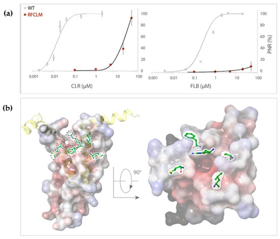The impact of these five amino acid changes upon diamide efficacy is shown to be extreme where diamide interaction is all but abolished, creating a channel similar in diamide interaction properties to the human hRyR channel itself (RFCLM EC50 for CLR = 20.4 µM, which is comparable to studies in mice []). The results confirm the location of the diamide interaction site as being within the voltage sensor-like domain. Figure 4b indicates the relative positions of the five modified residues in the pVSD region, where they encircle a cavity of high electronegativity. Such a region of high electronegativity, surrounded by an opening of neutral and electropositive residues, is a common feature of voltage-gated ion channels, frequently representing the site of ligand interaction.