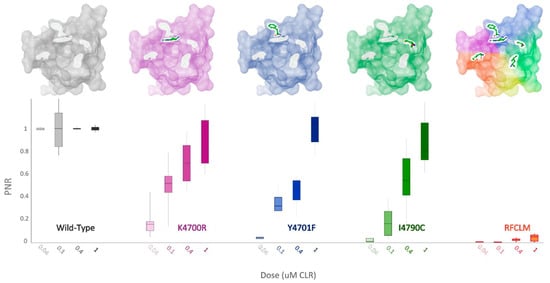 It has been established in this study that this residue appears to play a more significant role in CLR insensitivity than its neighbour, K4700 (Figure 6). However, field studies have indicated that substitutions at Y4701 might have differential effects vs. CLR and FLB []. Accordingly, the impact of the residue upon FLB efficacy was tested. As displayed in Figure 7, the Y4701F substitution surprisingly does not confer decreased sensitivity to FLB. Indeed, the alteration may confer an increase in FLB susceptibility by up to 5-fold.