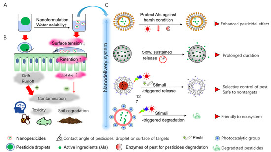 The benefits of nanotechnology for pest control. (A) Nanoformulation increase water solubility and stability of pesticidal active ingredients (AIs) by encapsulating AIs into small NCs-based pesticides that are conferring excellent characteristics at nanoscale. (B) Nanoformulation reduces surface tension of pesticidal droplets by decreasing the contact angle of droplets on the surface of targets (crop foliage), which contributes to a prolonged retention of droplets and a subsequently increase uptake ratio by target cells. This will be conducive to reduce the contamination caused by pesticides drift or runoff, bringing less toxicity to nontargets (mammal, pollinator, and aquatic organism) and bypassing yield reduction arising from the soil degradation. (C) Various nanodelivery systems that play a role in sustainable and smart application of pesticides.