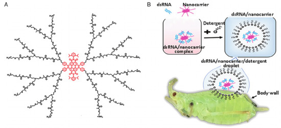 Schematic diagram of NCs-mediated delivery of dsRNA to control pests. (A) The chemical structure of the dendrimer nanocarrier and (B) The transdermal delivery system to enhance pesticidal effect of dsRNA. Reproduced with permission. (Adapted from Zheng Yang [33], with permission from the author).