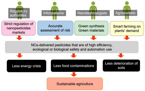 NCs-delivered pesticides are giving a fresh insight into sustained agriculture for a greater control efficacy and fewer side effects. It is increasing clear that the smart nanodelivery systems developed in past, present and further will plays vital role in dealing with the worldwide issues like the energy crisis, food contaminations, and deterioration of soils. Solving these issues will require strong collaboration among agronomists, nanotechnologists and informationist, to develop and apply multi-functional NCs-delivered pesticides that are beyond the properties of targeted control and regulated release. The responsibility of farmers could be to find the right time to degrade a smart pesticide by a balance between the high effect and less residues.