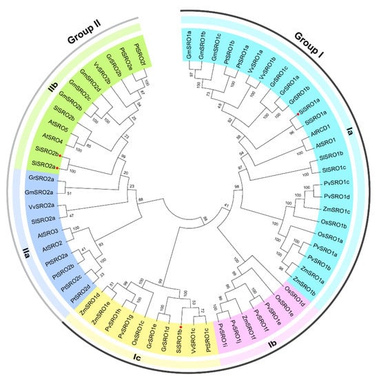 To investigate the evolutionary relationships of SRO genes among sesame and other plant species, a phylogenetic tree was constructed based on 64 putative nonredundant SRO protein sequences from ten species, including Arabidopsis thaliana, Glycine max, Oryza sativa, Zea mays, Gossypium raimondii, Solanum lycopersicum, Populus trichocarpa, Panicum virgatum, Vitis vinifera, and Sesamum indicum. As a result, these SROs were divided into two groups, namely Group I and II (Figure 1). Group I contained both eudicot and monocot plants, and Group II contained only eudicots. Group I and II can be further subdivided into three and two subgroups, including Ia to Ic and IIa to IIb, respectively (Figure 1). Group Ia contains AtRCD1 and AtSRO1 as well as their homologs from all selected species, while group Ib members only from monocot plants. SiSRO1a and SiSRO1b were clustered into subgroup Ia and Ic, respectively, whereas SiSRO2a and SiSRO2b were clustered into subgroup IIb (Figure 1).