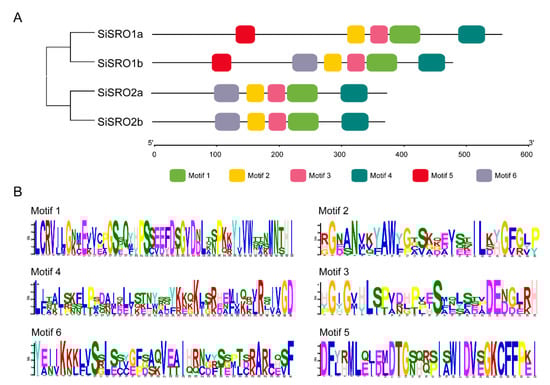 The conserved motif distributions of SRO family in sesame. (A). Distribution of the conserved motifs in SiSROs analyzed by MEME. Six motifs are marked by different colors. (B) Logo chart of the conserved motifs identified in SiSROs.