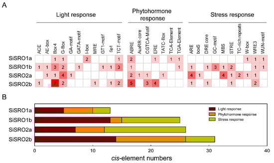 Predicted cis elements in the promoter regions of SiSRO genes. (A) Number of each cis element in the promoter region of SiSRO genes. Based on the functional annotation, the cis elements were classified into three major categories: light responsiveness-, phytohormone-, and stress-related cis-acting elements. The cis elements and their descriptions are listed in Table S2. (B) Sum of the cis elements in each gene and category.