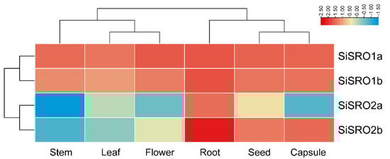 To investigate the possible roles of SiSROs, their expression levels were analyzed in different sesame tissues, including leaf, root, stem, flower, seed, and capsule. As shown in Figure 5, SiSRO1a and SiSRO1b showed a similar expression pattern, and they had strong transcripts in all detected tissues. SiSRO2b displayed more abundantly expression in root, seed, and capsule than other tissues, with the lowest transcript levels in stem. However, SiSRO2a exhibited relatively lower transcript levels than other SiSRO genes, with the highest and lowest expression in root and stem, respectively (Figure 5).