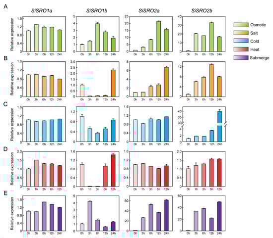 Expression profiles of the SiSRO genes in response to various abiotic stresses. (A–E) Expression of SiSRO genes under (A) osmotic (15% PEG 6000), (B) salt (150 mM NaCl), (C) cold (4C), (D) heat (42C), and (E) submergence treatments. Two-week-old seedlings were subjected to various stresses treatments. Relative expression levels of SiSRO genes were analyzed by qRT-PCR, using sesame SiH3.3 gene as the internal control. Error bars indicate standard deviations (SD) based on three replicates.