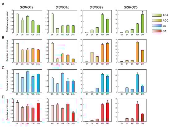 We also examined the expression of SiSRO genes under the treatments of various phytohormones, including ABA, ACC, JA, and SA. Under ABA treatment, the expression of SiSRO2a and SiSRO2b displayed a gradually upregulated pattern and reached the highest level at 12 h and 24 h, respectively, while the expression of SiSRO1a and SiSRO1b was significantly decreased (Figure 7A). Similar expression patterns were also found under ACC treatment (Figure 7B). Under JA treatment, the expression of SiSRO2a and SiSRO2b showed gradual upregulation and reached the highest transcriptions at 12 h, while the expression of SiSRO1b was downregulated at the earlier time point (3 h), subsequently increased and peaked at 6 h, and finally declined at the later time points (12 h and 24 h) (Figure 7C). Like JA treatment, SiSRO2a and SiSRO2b showed remarkably upregulated transcript abundance during all SA experiment time points, and their expression peaked at 24 h and 12 h, respectively (Figure 7D). On the contrary, the expression of SiSRO1a and SiSRO1b was significantly decreased at certain time points under SA treatment (Figure 7D). Overall, the expression level of SiSRO2a and SiSRO2b was increased under all four phytohormones treatments, while SiSRO1a and SiSRO1b showed downregulation or no obvious change.