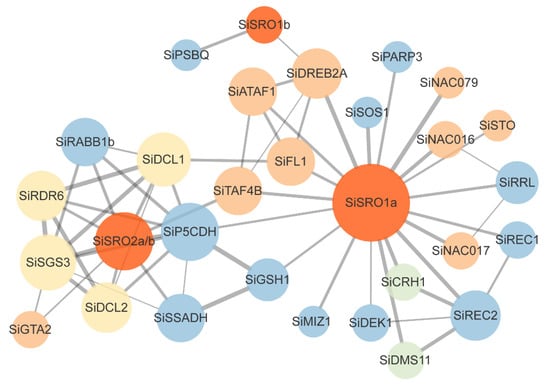 Protein interaction network analyses of SiSROs. Interaction networks were constructed based on homology of SiSROs in Erythranthe guttata using STRING database (https://string-db.org/, accessed on 11 October 2021). The sesame homologs of the SROs-interaction proteins in E. guttata were identified with reciprocal best BLASTP analysis and shown in network diagrams. Size of node indicates its connectivity degree, and the thickness/redness of the line represents the interaction score. Different colors represented different functional categories. The gene annotation of interaction proteins is available in Table S4.