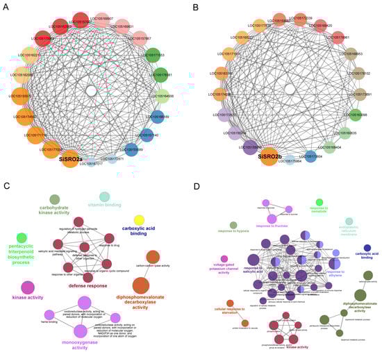 Co-expression analysis of SiSROs under abiotic stress. The co-expression network of SiSRO2a (A) and SiSRO2b (B). The co-expression neighbourhood of SiSROs was analyzed by mutual rank (MR)-based co-expression analysis based on transcriptomic data of sesame under various abiotic stresses. The 20 highly co-expressed genes with the smallest MR value are shown. GO enrichment of the co-expressed genes of SiSRO2a (C) and SiSRO2b (D). Functionally grouped network was generated in ClueGO with GO terms as nodes linked based on their kappa score level (≥0.3). Colors reflect the label of the most significant term per group. The node size represents the term enrichment significance.
