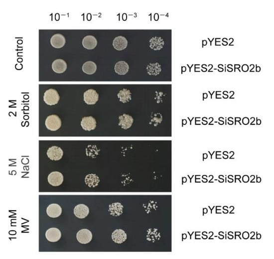 For the stress tolerance assay, yeast cells carrying pYES2 or pYES2-SiSRO2b were grown in SC-Ura liquid medium with 2% (w/v) glucose at 30 °C overnight. To induce the expression of SiSRO2b gene, the overnight cultures were adjusted to OD600 = 0.4 in induction medium (SC-Ura medium containing 2% w/v galactose) and cultivated at 30°C for 36 h. Then cultures were adjusted to an equal cell number and collected for stress treatments. Yeast cells were treated either with 5 M NaCl (salt stress), 2 M sorbitol (osmotic stress), or 10 mM MV (oxidative stress) for 24 h. Subsequently, serial dilutions were spotted onto SC-Ura agar plates and incubated at 30 °C. Each experiment was carried out in triplicate.