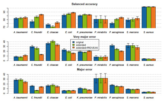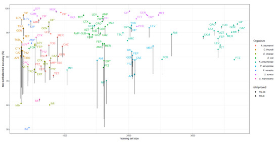 On the set of 110 datasets studied, the models trained on the extended feature set achieved balanced accuracy (bACC) improved by 1.5% on average; 62 models improved, 10 models performed exactly the same, and 38 models worsened. The largest improvements in bACC were seen for models of C. freundii and P. aeruginosa with an average of 6.4% and 5.2%, respectively.