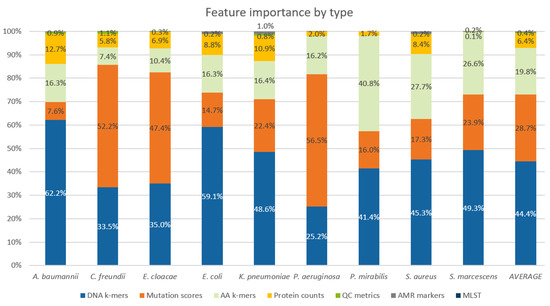 Even though PROVEAN features made up only about 5% of all features, for the models of P. aeruginosa, C. freundii, and E. cloacae, the mutation scores had about 50% contribution to the outcome of the new models. QC assembly metrics, MLST types, and AMR markers contributed little to the predictions (Figure 3).