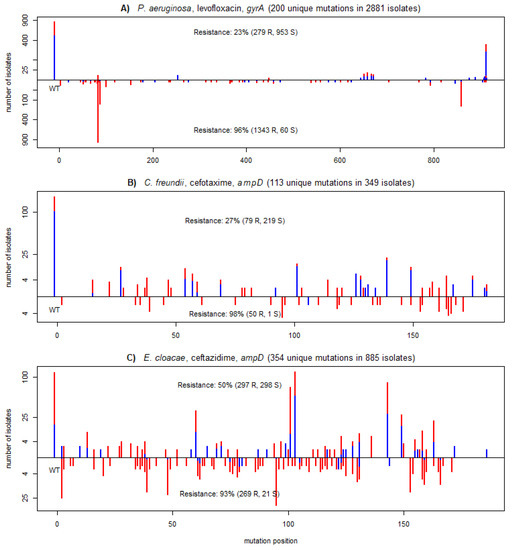 Mutational profiles across the three most important genes of the models for the following combinations: (A) P. aeruginosa, ciprofloxacin; (B) C. freundii, cefotaxime; and (C) E. cloacae, ceftazidime. Each plot shows the positional distribution of mutations of the most important gene for the model prediction. The bars show the number of assemblies having a given mutation at a given position, but only considering the most damaging mutation per assembly. Damaging mutations (PROVEAN scores lower than a gene specific threshold used by XGB models) are shown on the negative y-axis section; neutral mutations (score larger than or equal to the threshold) are shown in the positive y-axis section. The y-axis is shown in a square root scale. Red and blue colors correspond to assemblies resistant and susceptible to the given compound. The number of isolates identified as damaging or neutral along with the percentage of resistant isolates are shown for each group. Isolates with wild-type sequences are positioned at position -10 on the x-axis and labelled WT.