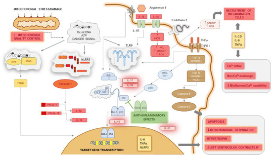 Inflammatory pathways trigger cardiomyocyte dysfunction in heart failure. Mitochondrial damage due to excessive mechanical and oxidative stress and decrease in mitochondrial quality control releases oxidized and hypomethylated mtDNA fragments and ATP, which along with other end-products, represent danger signals inside cardiomyocytes. These are perceived by three sensor systems: TLR9, the NLRP3 inflammasome, and the cGAS/STING complex. TLR9 triggers the IKK kinase that inactivates IκB, an inhibitory molecule on the Rel A/p50 complex of NF-κB; consecutively, this translocates to the nucleus. IL-6, TNF-α, and NLRP3 are among the primary target genes transcriptionally regulated by NF-κB. NLRP3 activates caspase-1, generating elevated levels of IL-1β and IL-18. TLR9 receives other activating signals from ligand-binding IL-1 and TNF RI complexes. The latter may also induce caspase-8 and caspase-3 through FADD, sensitizing the cell to apoptosis. IL-1β, IL-6, and TNF-α induce hypertrophy and suppress contractility, perturbing Ca2+ homeostasis and reducing myofilament Ca2+ sensitivity. When secreted in the extracellular space, they also recruit inflammatory cells together with peroxynitrite radicals generated by excessive activation of iNOS. Several other proinflammatory cytokines interact with critical steps of NF-κB activation, as IL-17 and IL-18 trigger IκB, IL-15 facilitates its nuclear translocation, whereas IL-33 upregulates gene transcription. For these reasons, IL-1β, IL-6, TNF-α, IL-17, IL-18, and IL-33 may all be putative therapeutic targets in heart failure.
