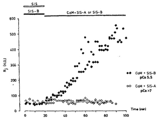 Changes in Junctional Resistance (Rj) in crayfish lateral giant axons in which one axon of the coupled pair was internally perfused with either of the following Standard Internal solutions (SIS): SIS (no added Ca2+, 0.1 mM EGTA, pH 7.1); SIS-A (no added Ca2+, 10 mM EGTA, pH 7.1, pCa > 7); SIS-B (1 mM CaCl2, 0.1 mM EGTA, pH 7.1, pCa 5.5); CaM + SIS-A or SIS-B (10 μM CaM, pH 7.1). Rj does not increase in the absence of CaM, either in the absence of Ca2+ (SIS) or with 1 mM Ca2+ (SIS-B), but does so greatly in the presence of Ca2+ + 10 μM CaM (CaM+SIS-B). In the authors’ words: “All data points were included in this figure, since the trend illustrated was observed in five other experiments with prolonged perfusion of calmodulin and high calcium”. Reproduced with permission from ref. [54].