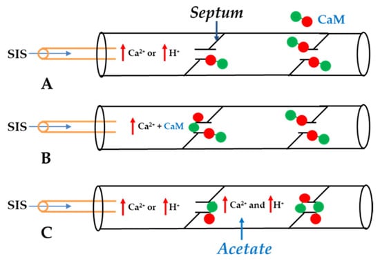 In 1988, Arellano and coworkers provided convincing evidence that CaM is in fact the soluble intermediate that had been washed out by the internal perfusion of crayfish axons [54] because when the lateral giant axons were internally perfused with Ca-CaM (pCa 5.5; CaM + SIS-B), the Rj increased from the control values of ~60 kΩ to 500–600 kΩ in ~60 min (Figure 1). In contrast, the axons perfused either with CaM in low Ca2+ solutions (pCa > 7; CaM + SIS-A), with CaM-free high Ca2+ solutions (pCa 5.5; SIS-B) or with Ca-free solutions (SIS), maintained the Rj at control levels during the 60 min perfusion time (Figure 1). Figure 2 schematically summarizes the results of Arellano and coworkers [54,59]. The same results were reported with either only one axonal segment perfused (Figure 2) or with both segments perfused. Significantly, while 20 min of the internal perfusion of one axon segment with 1 mM Ca2+ in the absence of CaM did not change the Rj, the subsequent addition of Na+-acetate to the external solution, while maintaining the same internal solution, increased the Rj to ~400 kΩ [54]. This is very significant for two reasons: first, it proves that the septum was not damaged by the SIS perfusion; second, it proves that the uncoupling effect of acetate on the intact axon segment is not just due to an increase in [H+]i [59], but rather to an acetate-induced rise in [Ca2+]i resulting from the drop in pHi (Figure 2), as also reported by us with different methods [32] (see in the previous).