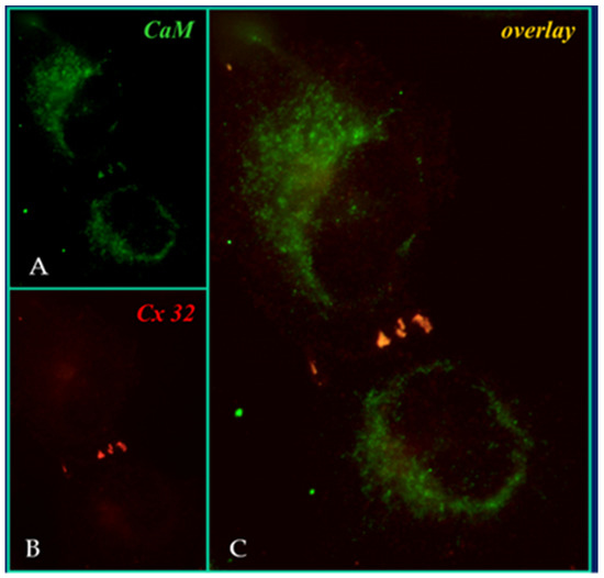 Immuno-fluorescence labeling of CaM (A) and Cx32 (B) in HeLa cells. The overlay of (A,B) is shown in (C). Cx32 and CaM colocalize at three punctuated areas of cell–cell contact. From ref. [72].