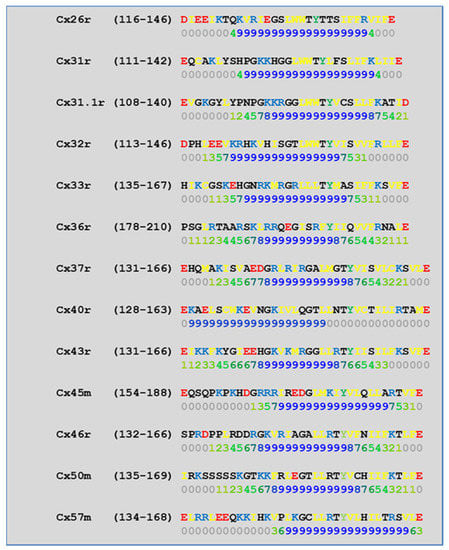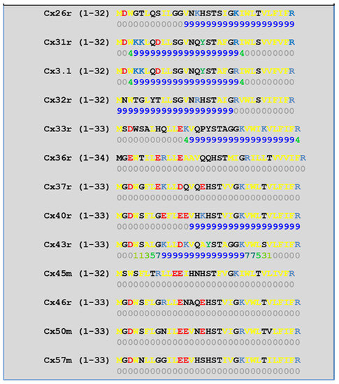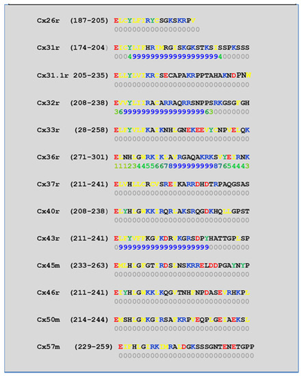 We have studied the CaM-binding prediction to the NT and CT1 domains of thirteen murine connexins by means of a computer program developed at the University of Toronto (http://calcium.uhnres.utoronto.ca/ctdb/ctdb/sequence.html, accessed on 28 November 2021. Copyright © 2021 Ikura Lab, Ontario Cancer Institute. All Rights Reserved). Figure 5 and Figure 6 show that seven connexins (Cx26, 31, 31.1, 32, 33, 40, and 43) have a potential CaM binding site at NT and only four connexins (Cx31, 32, 36, and 43) have a potential CaM site at CT1.