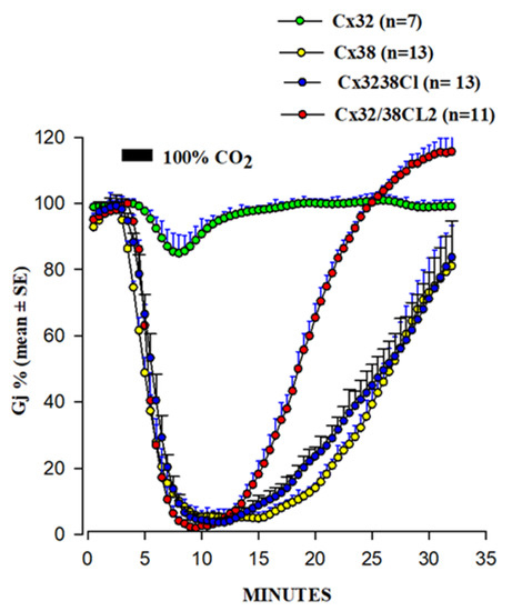 Gj drop induced by 100% CO2 in oocyte pairs expressing Cx32, Cx38, or Cx32/38 chimeras. Channels made of Cx32/38CL (Cx32’s CL replaced with that of Cx38) or Cx32/38CL2 (Cx32’s CL2 replaced with that of Cx38) reproduce the gating efficiency of Cx38 channels, although Gj recovers faster in Cx32/38CL2 channels. Adapted from refs. [108,109].