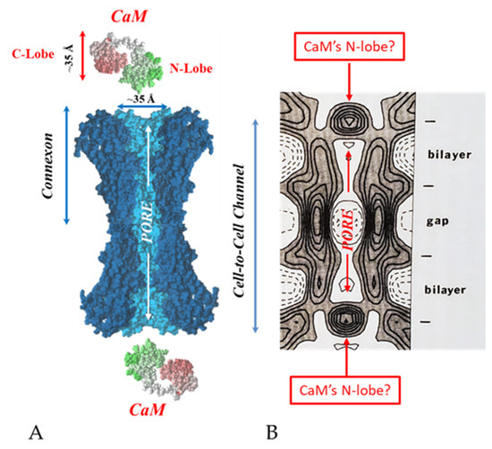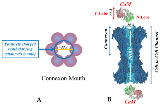 Both the positively charged channel’s mouth (A) and the negatively charged CaM lobes (B) are ~35 Å in diameter. Therefore, a CaM lobe could fit well in the channel’s mouth (vestibule) and electrostatically interact with it. In B, the channel is split along its length to display the pore diameter (light blue area) along the channel’s length. Both CaM and connexon images (B) were provided by Dr. Francesco Zonta (Venetian Institute of Molecular Medicine, VIMM, University of Padua, Italy).