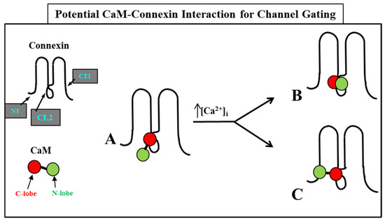 The Ca-CaM-cork gating envisions that a [Ca2+]i rise above resting levels (>~50 nM) causes a CaM lobe (most likely the N-lobe) to block the channel’s mouth (vestibule) by electrostatically and hydrophobically interacting with a receptor site located at CL2 or NT (CaM-gating site) (Figure 10). This interaction is also likely to induce a change in the connexin conformation. The CaM-gating site is likely to be close the channel’s mouth (vestibule) [19,112]. At basal [Ca2+]i (~50 nM), the CaM is believed to be anchored to each of the six connexins by one of its lobes (most likely the C-lobe), while the other lobe is likely to be free, but unable to access the channel’s mouth at resting [Ca2+]i (Figure 10).