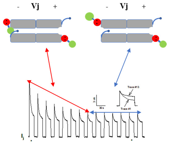 Gj slowly decays in oocytes expressing Cx32 subjected to long −100 mV Vj pulses. Note the progressive drop in Ij-Peak and, to a lesser extent, Ij-Steady-State. Gj peak drops exponentially by 50–60%, eventually reaching steady state. The large drop in Ij during the first 8 pulses is likely to result from the closure of both chemical/slow gate and fast Vj gate (double-headed red arrow). The Ij behavior of the following 6 Vj pulses is likely to reflect the closure of only the fast Vj gate of the remaining open channels (double-headed blue arrow). The CaM molecules are labelled in red and green colors to identify C-lobe and N-lobe, respectively. The inset shows a comparison of the time course of Ij seen in traces #1 and #13 (the asterisks below the main tracing indicate their location). Adapted from ref. [124].