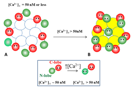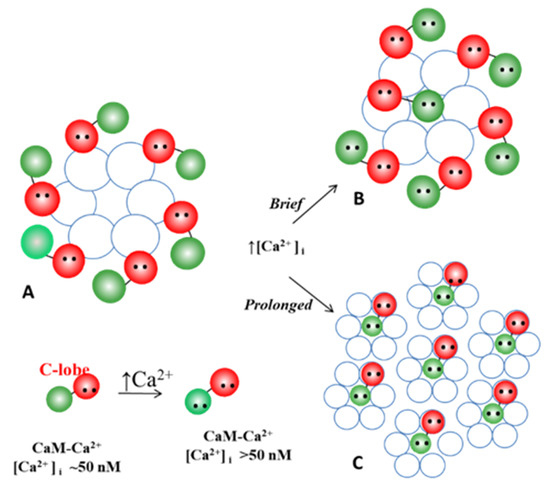 - Black, D.J.; Tran, Q.K.; Persechini, A. Monitoring the total available calmodulin concentration in intact cells over the physiological range in free Ca2+. Cell Calcium 2004, 35, 415–425. [Google Scholar] [CrossRef]