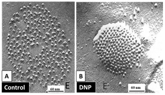 Freeze-fractured gap junctions (E face) of crayfish lateral giant axons fixed in coupled (A) or uncoupled (B) conditions. Uncoupling was caused by treatment with the metabolic inhibitor dinitrophenol (DNP). With DNP treatment, the channels’ arrays switched from loose (A) to tightly (hexagonal) packings (B), as the center-to-center spacing between channels decreased from ~200 Å (A) to <170 Å (B). Adapted from ref. [128].
