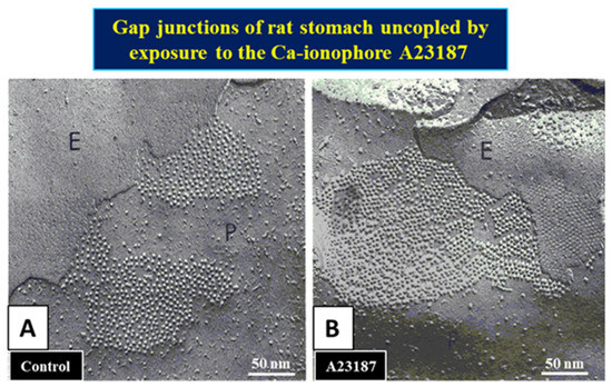 Evidence for an irreversible “locked-gate” state [42] brought to mind our early studies in which were reported changes in gap junction channel aggregation from loose to tight crystalline (hexagonal) arrays, both in invertebrate (Figure 13) and in mammalian (Figure 14) cells, subjected to treatments that uncoupled the cells by increasing [Ca2+]i [17,18,62,127,128,129,130,132]. We interpreted these data to reflect a switch from an open- to a closed-channel state.