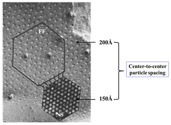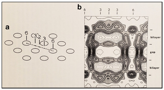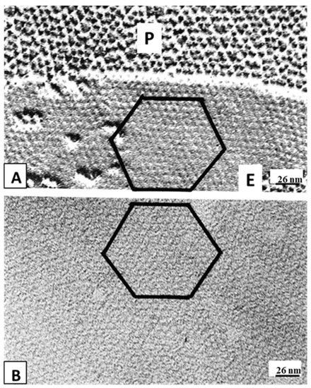 This interpretation was based on our earlier observation that gap junctions isolated from crayfish nerve cords and stained negatively with phosphotungstic acid (PTA) display tightly packed (hexagonal) arrays with ~150 Å center-to-center spacings [130] (Figure 15), which are the same as those of the gap junctions of axons fixed in an uncoupled state [128] (Figure 15). Crystalline (hexagonal) arrays were also observed in negatively stained gap junctions isolated from rat liver epithelia (Figure 16) [11]. Thus, we proposed that the channels of the isolated gap junction were in a closed state. We felt that gap junction crystallization is likely to reflect an irreversible state of channel gating (locked-gate state). In support of the gated state of isolated gap junctions in the crystalline state is crystallographic evidence demonstrating that the channels are blocked at both ends by a particle [120,121,122], which, significantly, is very similar in size to a CaM lobe (see in the following).