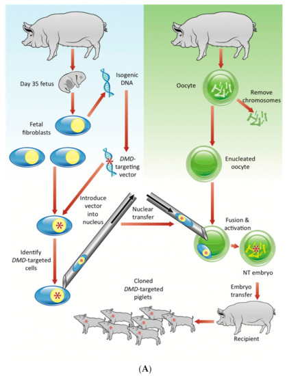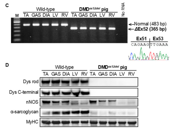 As such a model, pigs, particularly miniature pigs, are scientifically accessible and socially more acceptable than canine models. In many respects, the pig is more similar to the human than most other models, potentially helping to fill the substantial gap between currently available animal models and patients. Also, they are more amenable to the cloning technology of somatic cell nuclear transfer (SCNT) to obtain genetically identical piglets, as we previously demonstrated [24]. In contrast, SCNT in dogs has been reported to suffer from poor efficiency [25]. This unique property enables the production of various pig models of human diseases combined with genetic engineering technologies such as gene targeting [26]. These advantages provide an opportunity to introduce deletion mutations in “hotspot” regions as seen in patients [27], increasing the applicability of transgenic pigs to preclinical testing. Encouragingly, the development of such cloned pigs with the genetically engineered mutant DMD gene has been progressing [28,29,30,31]. However, further development and characterization of DMD pig models are essential to reveal the value of their applicability to preclinical research and better understand their pathogenesis.