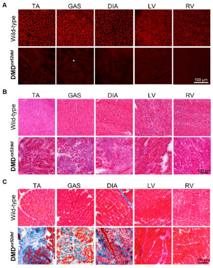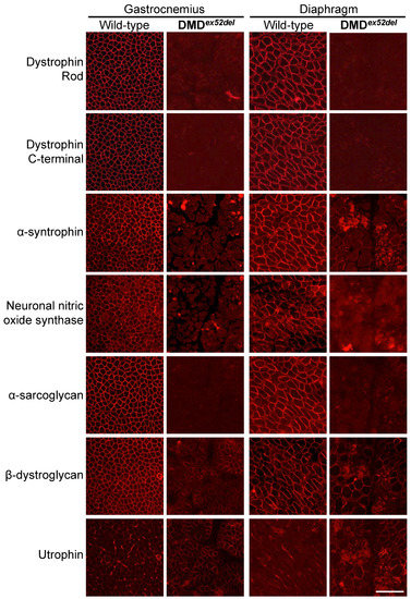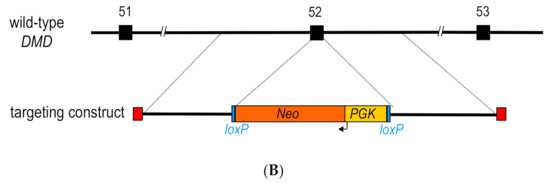 - Araki, E.; Nakamura, K.; Nakao, K.; Kameya, S.; Kobayashi, O.; Nonaka, I.; Kobayashi, T.; Katsuki, M. Targeted disruption of exon 52 in the mouse dystrophin gene induced muscle degeneration similar to that observed in Duchenne muscular dystrophy. Biochem. Biophys. Res. Commun. 1997, 238, 492–497. [Google Scholar] [CrossRef] [PubMed]