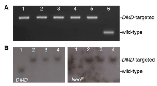 Male fetal fibroblasts were treated with the rAAV vector prepared above to remove DMD exon 52 from the pig genome via homologous recombination as previously described [24]. In brief, 24 h after seeding the primary fibroblasts (1.5 × 106) that were cultured without passaging, the cells were infected with the rAAV having the DMD targeting construct. Twenty-four hours after the infection, the cells were trypsinized and transferred to 96-well collagen-coated plates (BD Biosciences, San Jose, CA, USA). In 48 h, G418 (100 μg/mL) was added to the individual wells to select the targeted cells. Ten days later, each well was trypsinized (60 μL trypsin, 0.5% EDTA) for the cell collection. DMD exon 52 deletion and replacement by the NeoR was confirmed through PCR screen and direct-sequencing.
