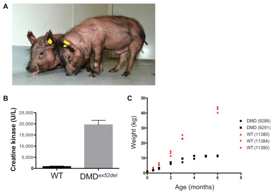 On phenotypic assessment, we observed progressive muscle weakness in DMDex52del pigs (IDs 9286 and 9291) with age (Figure 5A), essentially identical to dog models of DMD [19,22,36]. The DMDex52del pigs demonstrated less activity and dystrophic phenotypes such as an enlarged tongue (macroglossia), postural instability, and associated forward positioning of the pelvic limbs as seen in another large animal model, the GRMD dog [36]. Serum creatinine kinase was severely elevated to an average 19,581 U/L, standard error of the mean (SEM) ± 2021 (to convert U/L to μkat/L, multiply by 0.0167) in DMDex52del pigs within 24 h after birth compared to that in wild-type pigs (an average 816 U/L, SEM ± 267) (Figure 5B), consistent with what is seen in newborn patients and other animal models [6,37]. Growth of dystrophic pigs was remarkably impaired from 2 months of age compared to age-matched wild-type miniature pigs (Figure 5C). The affected pigs were euthanized around seven months of age due to their diminished body condition and weight loss.