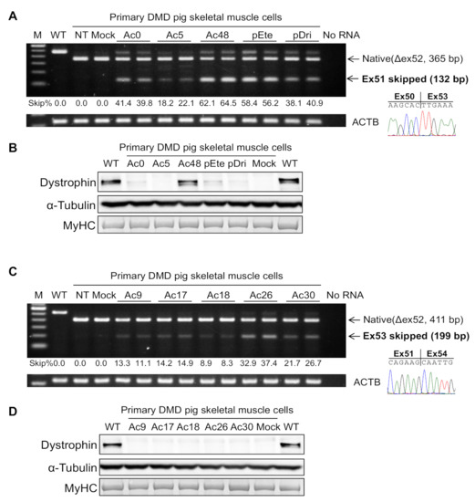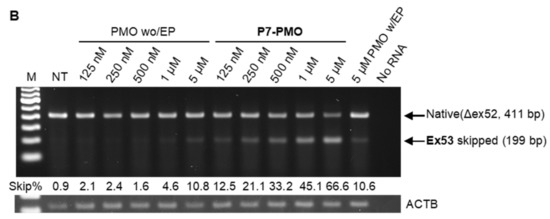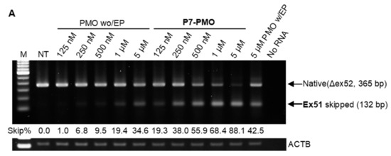 The feasibility of exon skipping in DMD pig skeletal muscle cells was tested using PMOs or P7-PMOs with select ASO sequences [63]. RT-PCR was performed as described above. Skipping percentage from the band intensity non-saturated was quantified by ImageJ software (NIH) as follows: exon-skipping efficiency (%) = exons skipped transcript intensity/(native + exon skipped transcript intensity) × 100. Bands of the expected size for the exon-skipped transcript were extracted using a gel extraction kit (Promega). The direct sequencing of the skipped bands was performed with Big Dye Terminator v3.1 (Applied Biosystems).