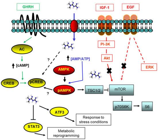 - Tulipano, G.; Faggi, L.; Losa, M.; Mortini, P.; Spinello, M.; Sibilia, V.; Pagani, F.; Cocchi, D.; Giustina, A. Effects of AMPK activation and combined treatment with AMPK activators and somatostatin on hormone secretion and cell growth in cultured GH-secreting pituitary tumor cells. Mol. Cell. Endocrinol. 2013, 365, 197–206. [Google Scholar] [CrossRef] [PubMed]