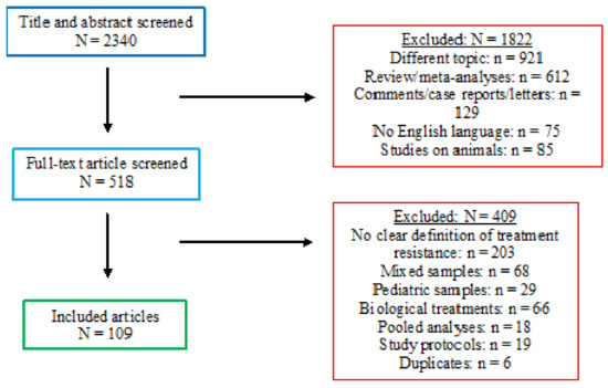 The full texts of the remaining 342 citations were examined in more detail, concluding that 235 studies did not meet the inclusion criteria because: one-hundred-twenty-four did not accurately define treatment resistance; forty-nine studies included mixed samples; forty-one articles were about neuromodulation; thirteen were pooled analyses; four were study protocols; four were duplicates.