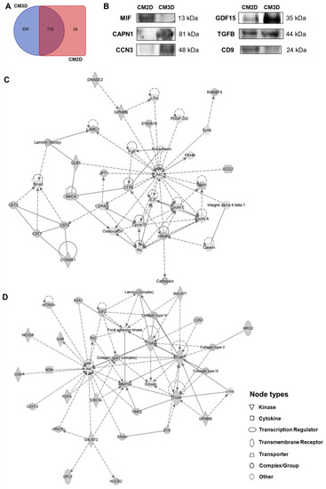 The proteomic data analyzed by IPA allowed the identification of several proteins within the MSC secretome (CM2D and CM3D) involved in important biological processes. Specifically, a deeper analysis was focused on essential processes involved in cytoprotection and tumor development, e.g., cell proliferation, migration and invasion, inflammation and oxidative stress. Both CM presented proteins involved in proliferation of both tumor and non-tumor cells, of which CAPN1, CST1, LAMC2 and RANBP3 stood out in CM3D and GPC6, ILK, MAPK1, MIF and PICALM in CM2D. In addition, both CM presented a remarkable quantity of different proteins that have been associated with antioxidant and/or anti-inflammatory effects and may thus mediate the viability of non-tumor cells, such as AIFM1, ANXA5, CD9, CDH13, GDF15, GSR and TIMP2. Additionally, comparing both CM, a higher proportion of proteins with these properties were identified to be unique to CM3D, such as COX6B1, CCN3 and S100A16, whereas only MIF and SDC4 were unique to CM2D. Regarding cell migration, cytokines such as TGFB and IL6 are common to both CM, whilst proteins such as CCN3, MMP8, PDCD5 have been identified to be unique to CM3D and associated with decreased cell migration. In addition, GPC6, ILK, MAPK1, MIF and SDC4 were unique to CM2D, being linked to increased cell migration. Lastly, cell invasion is known to be regulated by proteins that were identified in both CM such as TIMP1 and TIMP2. Among those proteins, CAPN1 (cell proliferation) and CCN3 (inflammation and cell migration), exclusive for 3D samples; MIF (cell proliferation, migration and invasion), exclusive for 2D samples and GDF15 (inflammation), TGFB (cell proliferation) and CD9 (antioxidant and/or anti-inflammatory effects) for both samples were chosen for validation of the proteomic data by Western blot analysis (Figure 1B).