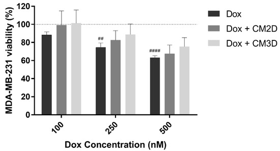 Exposure of MDA-MB-231 cells to MSC CM did not significantly affect the cytotoxic effect of Dox. MDA-MB-231 cells were incubated with 0–500 nM of Dox and both conditioned media, CM2D or CM3D, and cytotoxicity was evaluated by MTS reduction assay. Cell viability is expressed in percentage (mean ± SD, n = 3–6) to non-treated MDA-MB-231 cells (control). Grid line represents 100% cell viability (control). Statistical significance is expressed relative to control of non-treated cells, i.e., 100% viability as ## p < 0.01, #### p < 0.0001. CM2D, conditioned medium derived from 2D cultures; CM3D, conditioned medium derived from 3D cultures; Dox, doxorubicin.