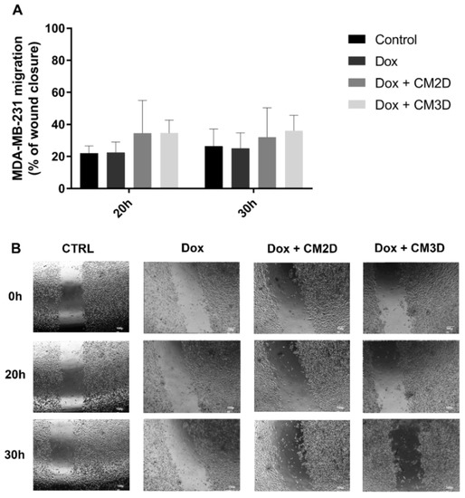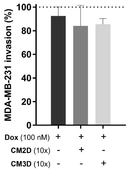 Along with cell proliferation, cell migration and invasion are also essential to understand the effect of CM when concomitantly added with Dox to tumor cells. Scratch assay results showed that MDA-MB-231 migration ability was slightly increased, although non-significant, upon treatment with Dox and CM2D or CM3D. IL-6 has been reported to be present in higher levels in CM2D than in CM3D [18] and has also been associated with the stimulation of the migration of breast cancer cells by induction of AKT, MAPK and STAT3 phosphorylation [61]. Moreover, proteins exclusively identified in CM2D such as GPC6, ILK, MAPK1, MIF and SDC4 have been associated with positive regulation of cell migration [38,39,40,42,62]. On the other hand, CCN3, PDCD5 and MMP8 were found to be uniquely identified in CM3D and have been associated with negative regulation of cell migration [63,64,65]. Metalloproteinases (MMPs) have been correlated with increased tumor cell migration and invasion through degradation of the basement membrane. However, it has been suggested that MMP-8 has a tumor suppressive role in breast cancer cells that, in contrast to gastric and liver tumors, leads to inhibition of migration, invasion and metastasis, both in vitro and in vivo [64]. This interesting role in breast cancer may be due to the inhibition of TGF-β with subsequent activation of programmed cell death 4 (PDCD4), decrease of MMP-3 and MMP-9 and increase of cell adhesion [64].