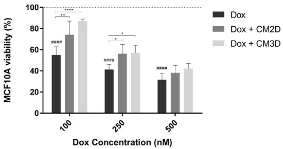 To assess the effect of the secretome of MSCs on the cytotoxicity of Dox in non-tumor breast epithelial MCF10A cells, a MTS assay was used. Similar to tumor cells, Dox exposure led to a concentration-dependent effect on cell viability (Figure 5). Conversely, the concomitant exposure of MCF10A cells to Dox and CM3D resulted in an increase in the percentage of cell viability of approximately 32 ± 6% (p < 0.0001) and 16 ± 2% (p < 0.05) for Dox concentrations of 100 and 250 nM, respectively, when compared to cells treated with Dox. This beneficial effect was also observed, although to a lesser extent, within combinatory treatment of Dox and CM2D with an enhanced cell viability of 19 ± 5% (p < 0.01) and 15 ± 4% (p < 0.05), for 100 and 250 nM of Dox, respectively.