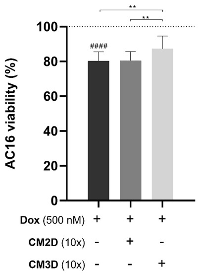 To evaluate the effect of the CM2D/CM3D on Dox-treated cardiomyocytes, AC16 differentiated cells were used to establish an in vitro cardiac model [34]. Dox exposure led to a decrease in cell viability of approximately 20 ± 5% (p < 0.0001; Figure 6). Moreover, the concomitant exposure to CM2D and Dox did not show significant improvement in cell survival (82 ± 7% Dox and CM2D vs. 80 ± 5% Dox alone; n.s.). On the other hand, the combinatory treatment of Dox and CM3D presented a significantly higher cell viability when compared to the group treated with Dox alone (87 ± 7% Dox and CM3D, p < 0.01) or with Dox and CM2D (p < 0.01), emphasizing the beneficial effect of CM3D (Figure 6).