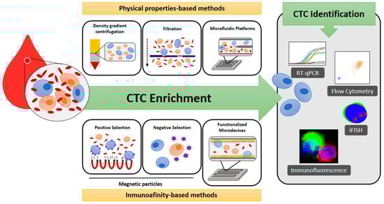 Prior to the identification of CTCs, blood samples require an enrichment method to purify such a minority cell population. Methods for CTC enrichment may be classified into positive and negative. These are not mutually exclusive and can therefore be combined to optimize the capture of CTCs. Negative-enrichment methods are based on the removal of white blood cells by antibody-based depletion strategies usually based on anti-CD45-coated magnetic beads or CD45 depletion cocktails. Enriched CTCs can be detected afterward by several different methodologies such as immunocytochemistry (ICC) [,,,,,], quantitative real-time polymerase chain reaction (PCR) [,,], flow cytometry, or immunofluorescence in situ hybridization (iFISH) [,,,,,], which may combine several probes or antibodies to identify different CTC subpopulations. In contrast, positive-enrichment methods take advantage of specific biological and physical properties of CTCs to distinguish them from non-tumoral blood cells. Physical enrichment strategies are frequently based on centrifugation and microfiltration [,,,,,,,,,,,,,,,,,] to selectively isolate CTCs according to their differential density and size, respectively []. Among all the positive-enrichment methods, immunoaffinity is the most widely used but the optimal biomarker matching all CTC subpopulations is unknown. Different combinations of antibodies can be immobilized on the surface of magnetic particles or microdevices with increased capture efficiency [,]. As with negative-enrichment methods, isolated CTCs can be subsequently identified by common methodologies (Figure 1). The sensitivity for the detection of CTCs varies greatly between the different methods used, and even between different studies that use the same methodology.