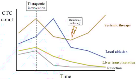 Preoperative CTCs have been widely associated with HCC recurrence after LR [,,,,], LT [,,] or local ablation []. Theoretically, a complete tumor removal by LR or LT may motivate a rapid decline in CTC count in the post-operative period. Similarly, local ablation therapies could release CTCs to the bloodstream initially, followed by a progressive decline until complete clearance. In patients receiving systemic therapies, the dynamic of CTC counts may vary depending on the therapeutic response. In any of these situations, trends of CTC count after therapy could provide valuable information to predict tumor recurrence or to anticipate resistance to systemic therapies (Figure 2).
