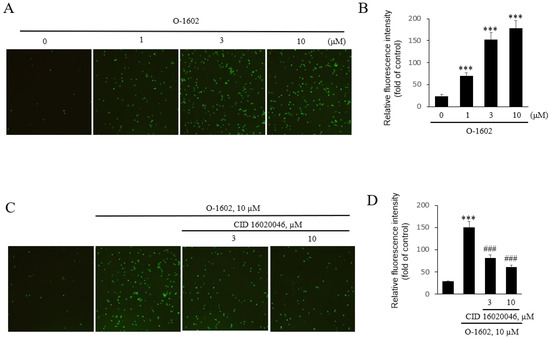 The THP-1 cells were grown to 90–95% confluence in 12-well plates. One microgram of plasmid DNA and 2 µL of Lipofectamine LTX reagent (Invitrogen, Carlsbad, CA, USA) were separately diluted in 50 µL of Opti-MEM medium (GIBCO, New York, NY, USA), mixed together, and incubated at room temperature for 30 min. Cells were then washed with serum-free medium before adding 400 µL of Opti-MEM medium, and then the diluted mixed solution was added to the cells. Plates were incubated at 37 °C for 6 h. Subsequently, the conditioned medium was removed, and the cells were grown in fresh medium containing 10% FBS for 24 h. Cells were untreated or treated with O-1602. Cell lysates were prepared using passive lysis buffer from Promega assay system (Promega, Madison, WI, USA) and were used to measure luciferase activity according to the manufacturer’s instructions for the dual luciferase reporter assay (Promega, Madison, WI, USA). All firefly luciferase values were normalized to Renilla luciferase to compare transfection efficiencies. The results are presented as the mean ± SEM of a representative experiment performed in triplicate.