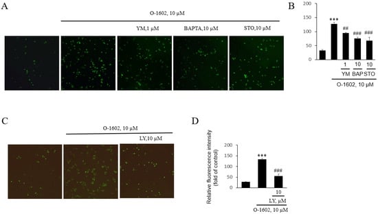 Effects of YM254890, BAPTA-AM, STO-609, and LY294002 on O-1602-induced THP-1 monocytes adhesion to endothelial cells. THP-1 cells were pretreated with the indicated concentrations of inhibitors for 1 h, and then treated with 10 μM O-1602 for 24 h. The calcein-labeled cells were seeded onto confluent HUVECs and images were obtained after 2 h. (A) Representative fluorescence microscopic images of THP-1 monocyte adhesion to HUVECs in the presence of YM254890, BAPTA-AM, and STO-609. (B) Histogram of THP-1 monocyte adhesion to endothelial cells in the presence of YM254890, BAPTA-AM, and STO-609. (C) Representative fluorescence microscopic images of THP-1 monocyte adhesion to HUVECs treated with LY294002. (D) Histogram of the adhesion of THP-1 monocytes to endothelial cells with LY294002. The results are presented as the mean ± SEM of three independent experiments. Statistical significance: *** p < 0.001 vs. untreated control cells, ## p < 0.01, ### p < 0.001 vs. O-1602-treated cells.