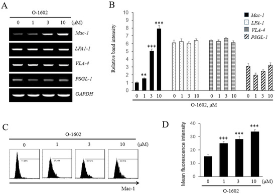 Effects of O-1602 on the expression of adhesion molecules in THP-1 cells. THP-1 cells were treated with the indicated concentration of O-1602 for 24 h. The mRNA expression of adhesion molecules was analyzed by RT-PCR. (A) Representative RT-PCR images. (B) Histograms showing the relative mRNA levels. (C) Representative flow cytometry images of Mac-1 protein. (D) Histograms showing relative Mac-1 protein levels. The results are presented as the mean ± SEM of three independent experiments. Statistical significance: ** p < 0.01, *** p < 0.001 vs. untreated control cells.