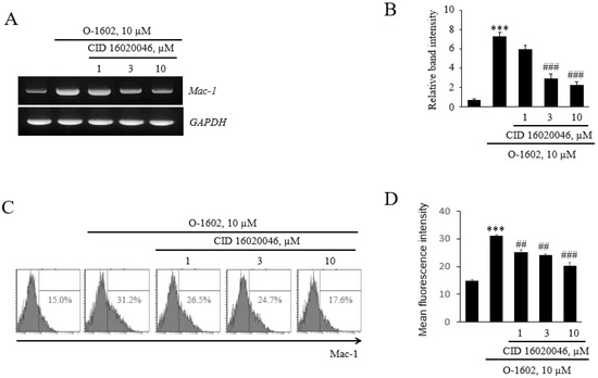 Next, we investigated how GPR55 activation induces monocyte adhesion by examining the expression of adhesion molecules in THP-1 monocytes. Among adhesion molecules of the monocyte membrane, GPR55 activation induced Mac-1, but not other adhesion molecules, such as LFA1-1, VLA-4, and PSGL-1 (Figure 3A), and the induction of Mac-1 was found to be concentration-dependent (Figure 3B). In order to confirm the effect of GPR55 activation on the mRNA expression of Mac-1, its protein levels were checked by flow cytometry. It was found that O-1602 induced the protein expression of Mac-1 (Figure 3C), and the induction of Mac-1 was concentration-dependent (Figure 3D). Pretreatment with CID16020046 suppressed the O-1602-induced mRNA expression and protein expression of Mac-1 in a concentration-dependent manner (Figure 4), demonstrating the involvement of GPR55 in Mac-1 expression in monocytes.